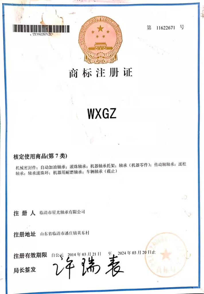 Shandong Starlight Bearings has ISO-9001 Quality Mangement System Certificate, CE mark certification. The brand WXGZ also registered with China’s Ministry of Commerce.